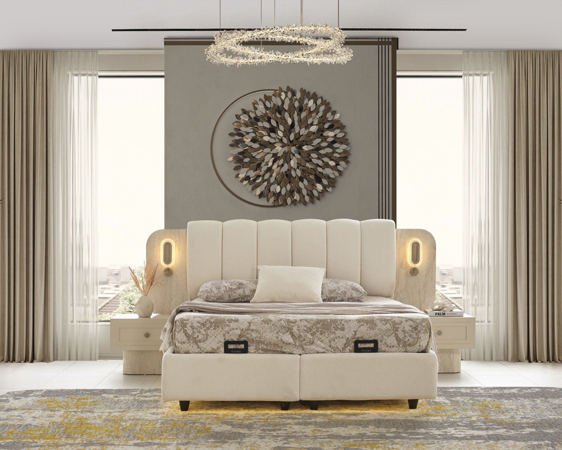 Geniş depolama alanına sahip Galata Yatak Odası 6 kapaklı dolabı, kullanışlı şifonyer ve komodinleri ile hem düzenli hem de konforlu bir yatak odası oluşturabilirsiniz. Ürün, baza ve başlık dahil olarak sunulmaktadır.